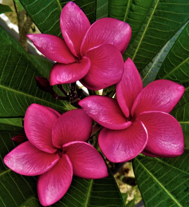 A very large frangipani with reddish-purple, burgundy-colored flowers! Really stunning. A glorious tree when in flower.