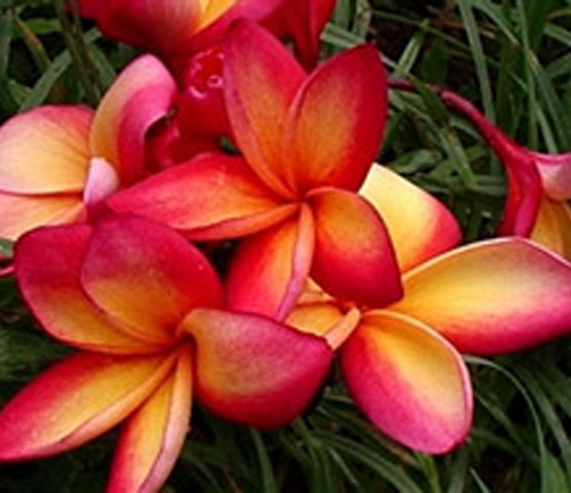 A boldly colored red and gold plumeria with round petals and coconut oil perfume. A special flower. Eventually grows into a huge tree.